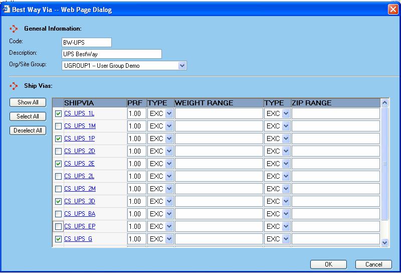 Show All - Click on this button to have all the ShipVias for the Org/Site Group displayed in the ShipVia section of the window. This button switches between Show All and Show Sel depending upon actions taken.