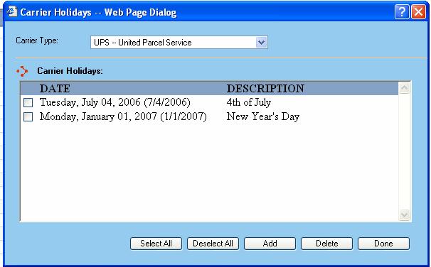 Delete - This button will delete any selected dates listed in the Carrier Holidays.
