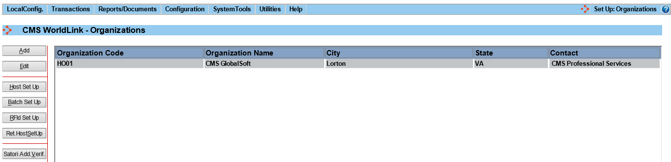 Organizations represent the companies sending out shipments. WorldLink will either be configured to allow only one possible Organization or it will be configured to allow more Organizations. Configure the Organization that you ship for by selecting this menu option. Depending on the license purchased for your business, you may have only one Organization (ship for yourself) or you may have many Organizations (e.g. a fulfillment house). The list of configured Organizations appear in a window like that shown below: