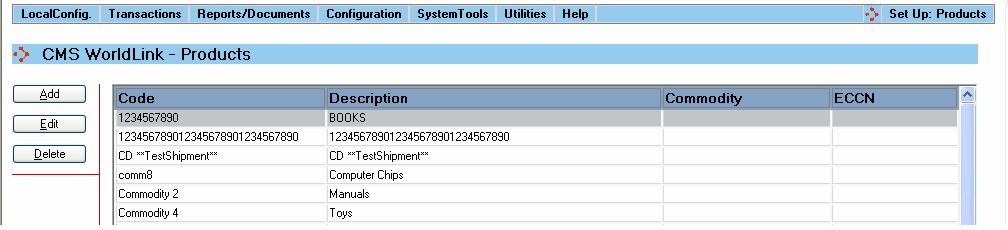 The Products support table allows for the entry of Products shipped by your business. The information entered here can help reduce shipment processing time for international shipments. Selecting this menu option produces a display like that shown below:
