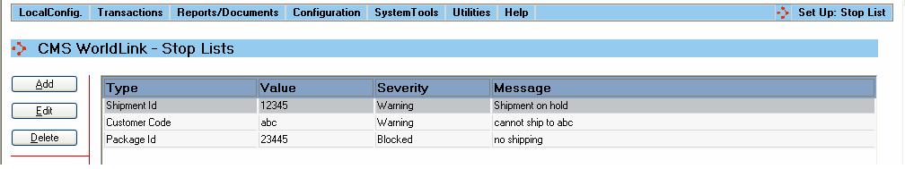 The Stop List support table allows for managing shipping Stop Lists. You can stop shipments by either Customer Code, Shipment ID, or Package ID. Selecting this menu option produces a window like that shown below: