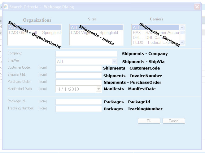 The ShipVia data field allows for searches based on a particular carrier/service pairing. Care must be taken when choosing this criteria as a conflict between the Carriers listing and the ShipVia entry may cause no data to be returned.