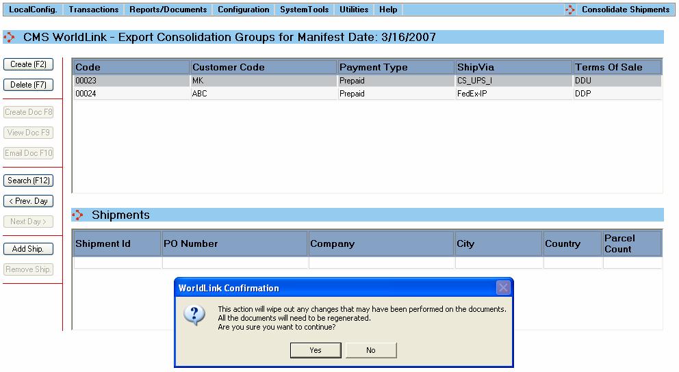 Shipments can be added to the selected consolidation group at any point of time by clicking on the “Add Ship.” button. Upon adding a shipment, all the user changes performed previously on the group data will be erased. This in turn will require for all the export documents to be recreated. The user will be required to confirm this action via following pop-up: