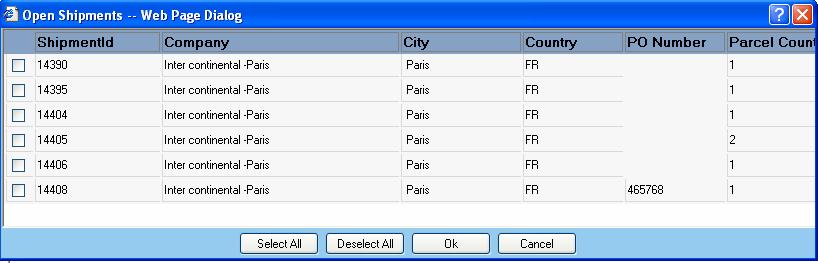 Upon confirmation by the user, WorldLink will display a list of all the open international shipments (the shipments that have not yet been part of a consolidation group) that satisfy the criteria of the selected consolidation group. Shipments can be added one by one or multiples at a time by selecting the desired row(s).