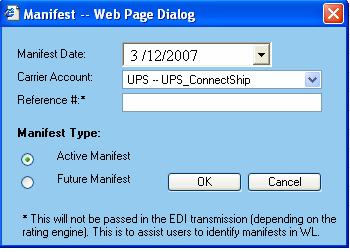 The Manifest Type radio button options of Active Manifest and Future Manifest designate the type of manifest being created. Active manifests can only be created for the current day and there should be only one active manifest per carrier. Future manifests can be created up to any day forward from the current day. Note: FedEx only allows up to 2 weeks from the current day.