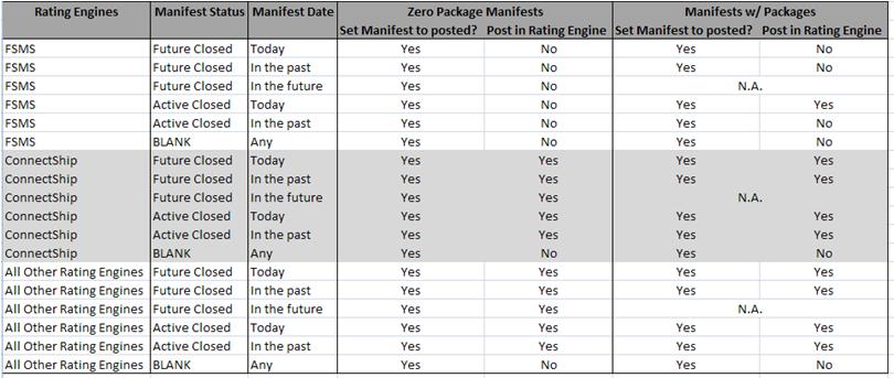 See the table below for what happens when posting manifests based on their rating engine, manifest date, status and number of packages. For example, manifests with zero packages are not posted in the rating engine when the rating engine is FSMS. For all other rating engines, zero package manifests are posted in the rating engine unless the manifest status is blank.