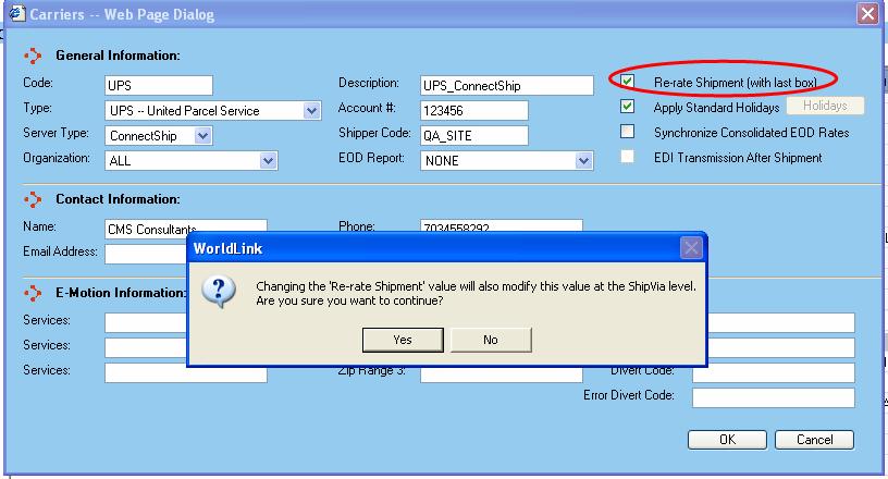 On clicking the “OK” Button, a confirmation message is displayed as shown above. Selecting the Re-Rate option for the carrier will select re-rate for all the existing shipvias of the selected carrier. Similarly, unchecking the Re-Rate option will disable Re-Rate for all the existing shipvias for the carrier.
