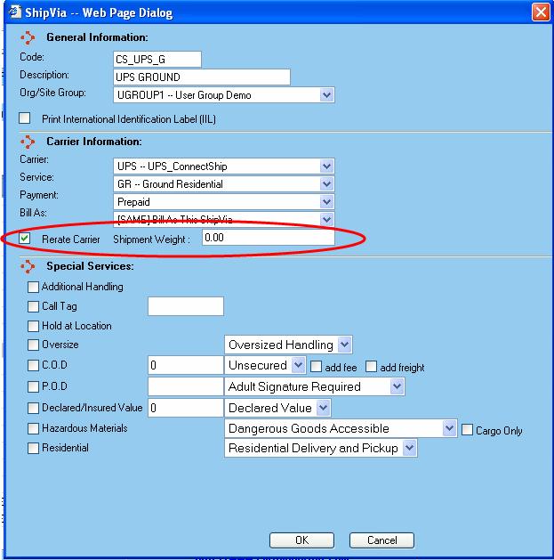The Re-Rate option can also be individually enabled/disabled for shipvias in a carrier. This option for shipvias has an added facility of specifying a minimum weight required for Re-Rate. Only those shipments exceeding this minimum weight will be re-rated. User can configure this as shown below: