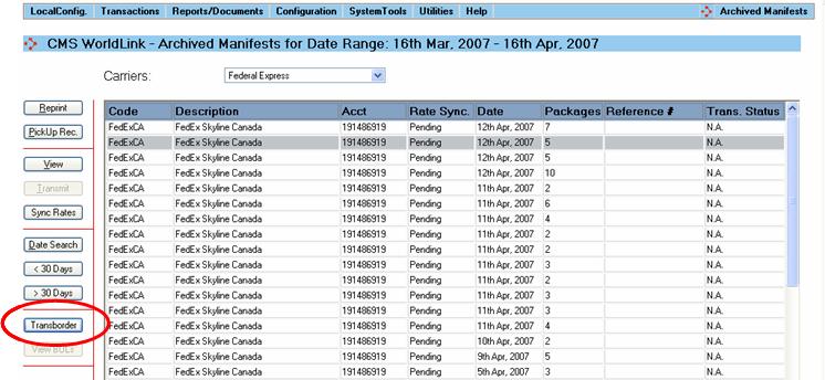 Once a Transborder shipment has been posted, it can be viewed and the corresponding documents can be printed from the Archived Manifests screen. Select the appropriate manifest and select the Transborder button: