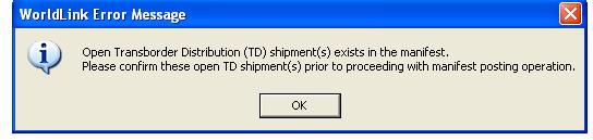 Cannot post a manifest with TD shipments until the TD shipment has been confirmed. This is a manual process. If you try to post a manifest with unconfirmed TD shipments, the following message will appear: