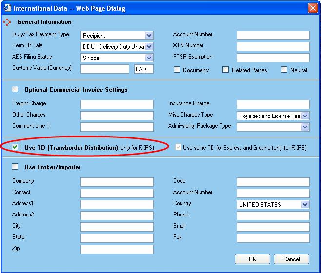 WorldLink will check if it is a TD package/shipment or not. If yes, then continue to the next step; otherwise continue with the normal shipping process. This can be indicated manually by selecting the International Button on the Process Shipments screen and selecting the Use TD checkbox: