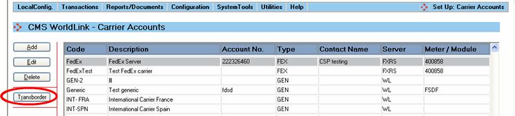On the carrier accounts screen, select the Transborder button (this button is only available for FedEx carriers).
