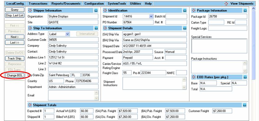 When viewing a shipment associated with a Bill of Lading that has not been assigned to a Master Bill of Lading (manifest), you have the option to change the Bill of Lading that the shipment is assigned to by selecting the Change BOL button.